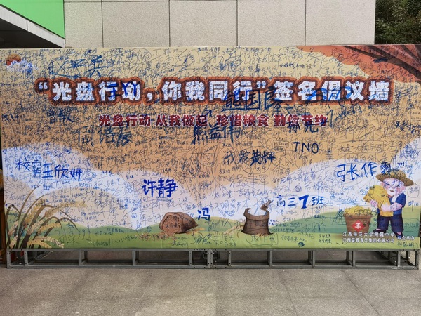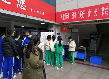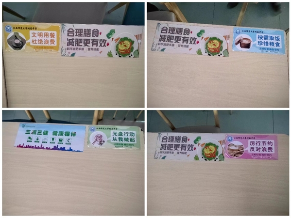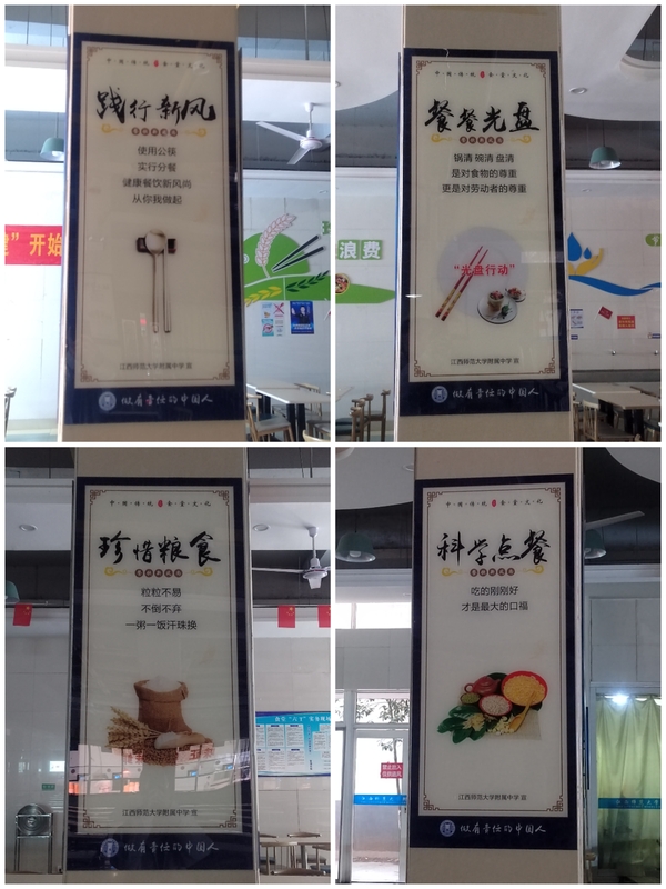 珍惜粮食,拒绝浪费。学校在每一张餐桌上都张贴了“厉行节约,反对浪费”“光盘行动,从我做起”“按需取饭,珍惜粮食”’文明用餐,杜绝浪费”等标语,同时在餐厅的墙壁上也张贴了“践行新风”“餐餐光盘”“珍惜粮食”“科学点餐”等标语,提醒同学们勤俭节约、反对餐饮浪费,文明用餐,让我们从珍惜一粒米、一餐饭开始,拒绝舌尖上的浪费,使光盘成为习惯,你我同行,共同行动,与文明行为握手,向浪费陋习告别,让勤俭节约的校园蔚然成风